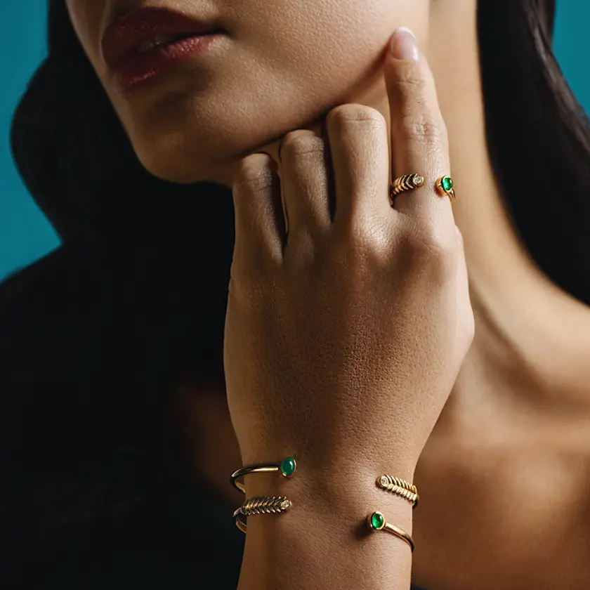 Demeter, goddess of the earth and harvest plays a protective role towards humans. Mother goddess, she is assimilated to the nourishing earth. She weaves the link between crops and farmers. Demeter’s Ear of Wheat bracelet by ASTROM tells the symbiosis between cereals, sources of benefits, and the Earth which gives birth to them. A beautiful intense oval cabochon-cut emerald, representing the Earth, unites with an ear of wheat where sprouts a delicate diamond, metaphor of the mother who gives life.