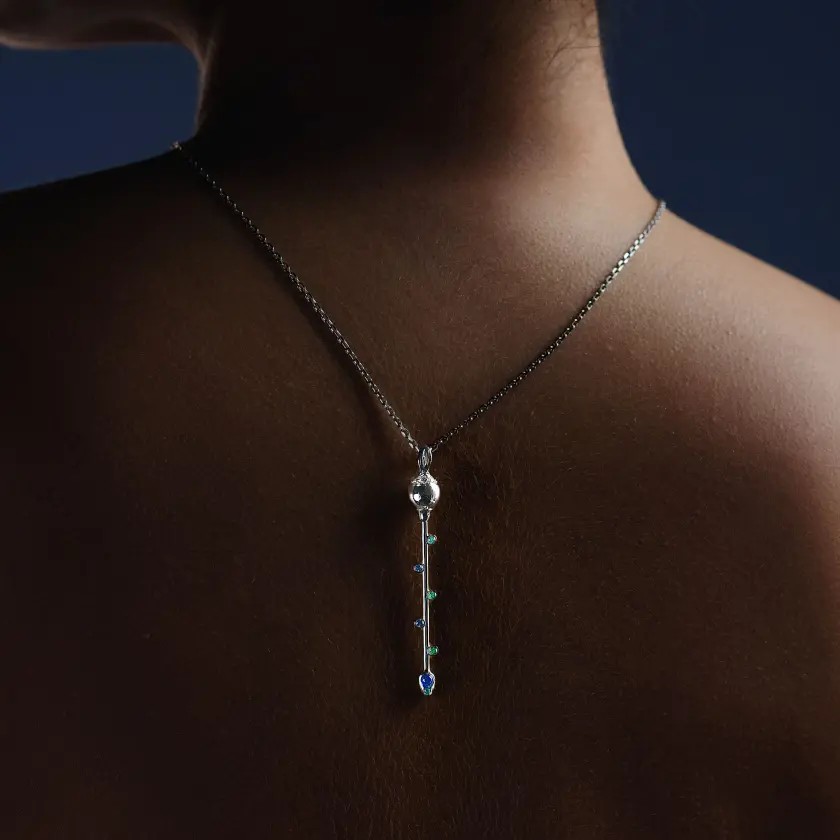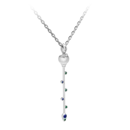 Hera’s Sceptre necklace in 18-carat recycled white gold, set with brilliant-cut emeralds, cabochon and brilliant-cut sapphires, and diamonds. The interplay between the sapphires and emeralds, combined with the shape of the base, is reminiscent of the feathers of the peacock, the favourite animal of the Goddess Hera.