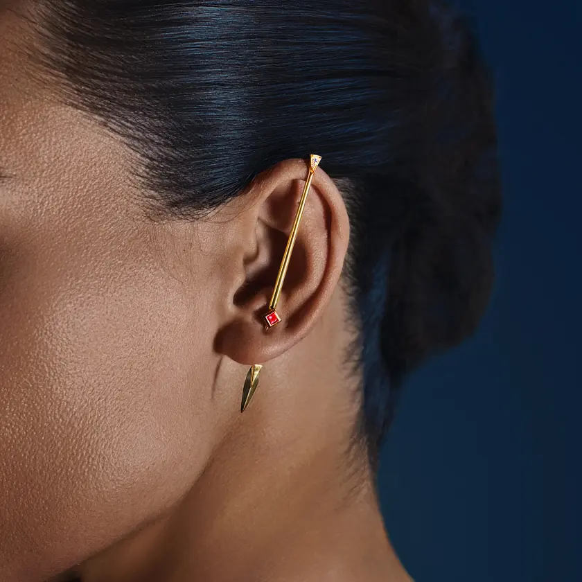 Mono boucle d’oreille La Lance d’Athéna en or jaune recyclé 18 carats, serti d’un rubis intense taille princesse et de diamants. Ce bijou épouse l’oreille avec un maintien discret et confortable, offrant une allure singulière et raffinée.