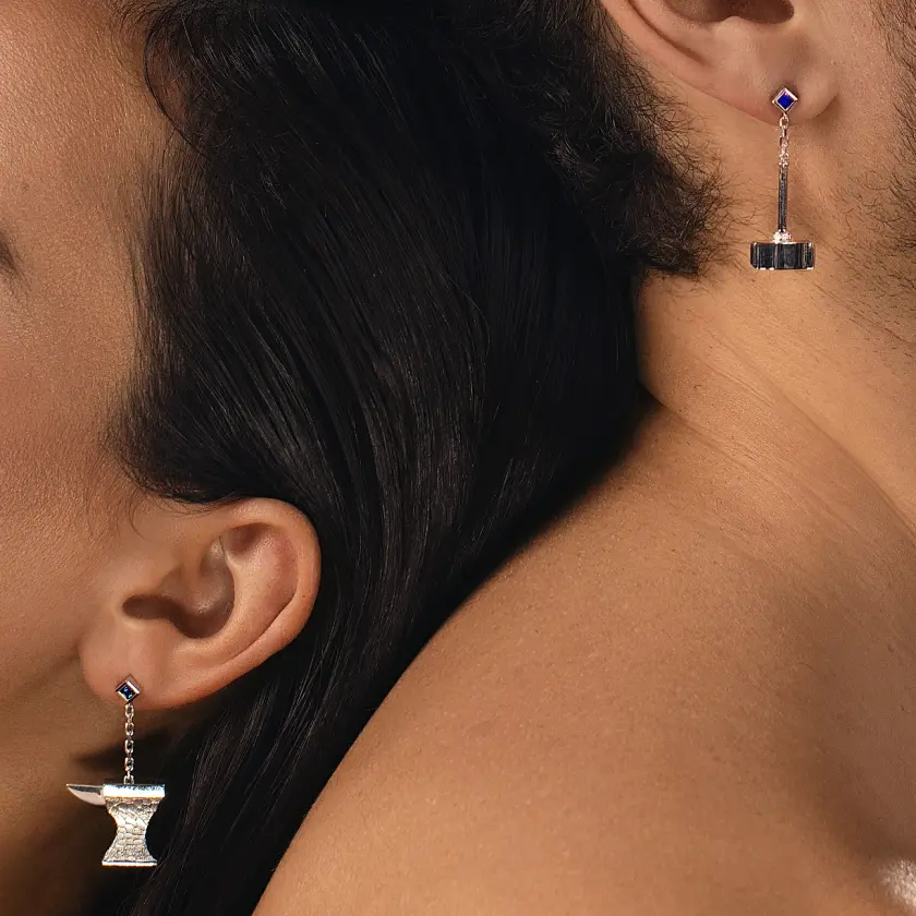 Pendants d’oreilles Le Marteau et L’Enclume d’Héphaïstos en or blanc recyclé 18 carats, sertis de deux saphirs intenses taille princesse et de diamants. Un martelage remarquable sur l’enclume contraste avec le poli brillant du métal. Un bijou audacieux, d’une extrême finesse et d’une élégance affirmée.