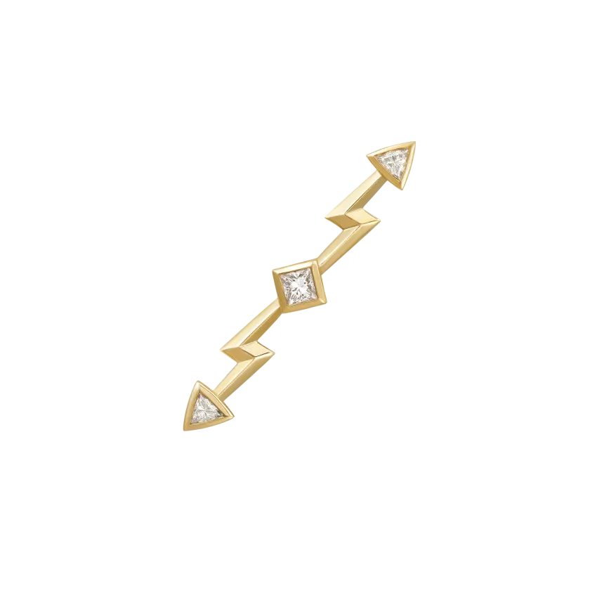 Mono boucle d’oreille L’Éclair de Zeus en or jaune recyclé 18 carats, serti de diamants taille troïdia et princesse. Ce bijou cré une vraie singularité électrique au porté, entre audace et finesse.